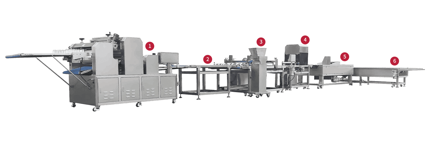 De productielijn bestaat uit een ST-868-600 Pastry broodvormingsmachine, vierkanaals spanmachine, vierkanaals meelrolmachine, vierkanaals concentratiemachine, CT-QT450 dubbele servo gestoomde broodtafel en CT-WP500 horizontale plaat-machine (Model 500).
